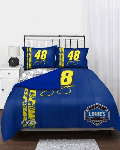 BE IN THE RACE EVEN IN THE BEDROOM WITH THE NORTHWEST COMPANY'S FULL SIZED BEDDING SET IN A BAG. JIMMIE JOHNSON #48 SET INCLUDES TWO PILLOWCASES, ONE COMFORTER, ONE FLAT SHEET, AND A FITTED SHEET TO COMPLETE YOUR BED! MADE OF 100% POLYESTER THIS WARM AND COMPLETE SET IS THE PERFECT ADDITION THE ANY NASCAR FAN'S ROOM!