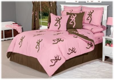 Reversible comforter also features soft pink buckmarks on brown background side Comforter set includes comforter, bedskirt, and shams Matching sheet set and drapes available Machine washable Sure to catch the eye of ladies.
