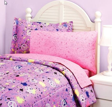 Fun and funky, this bedding is a blast from the past. Peace signs and paint splatters are back in a big way. Done in a pink and purple color combo with accents of yellow and lime it's a look any girl will love.