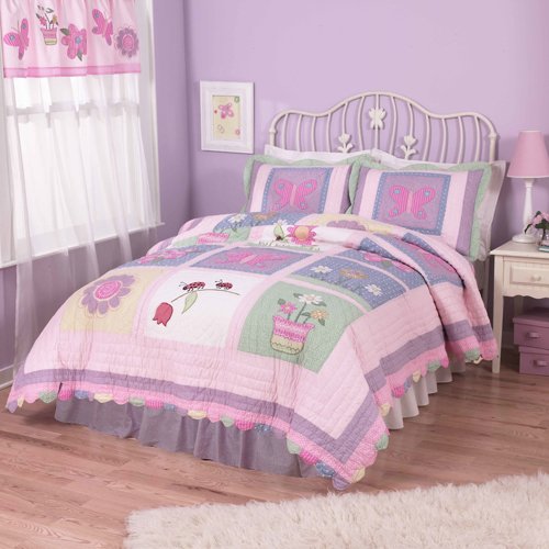 This bright and fun quilt for girls features patterns of red lady bugs, butterflies, and flowers. Each of these patterns is hand crafted and embroidered into the quilt. We take care when putting details into this pattern, from the individual pattern pieces to the delicate scalloped edges.