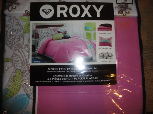 Your bedroom will be pretty in pink with this lovely Be True complete duvet ensemble! Based on young women's sporting apparel from the well-known Roxy brand, the face of the duvet cover and the standard, knife-edge pillow shams highlights a bright, bubble-gum pink shade accented by a large asymmetrical band of stylized stenciled flowers in shades of turquoise, sage green, pink and chocolate on a white ground, set off by chocolate piping. The duvet cover also features a large image of the stenciled flowers along with Roxy's classic heart-shaped logo; duvet cover features a button closure and reverses to solid chocolate. The corner of the sham is embellished with the Roxy logo stenciled in chocolate. The coordinating, all-cotton 200-thread-count sheets and pillowcases feature an all over tossed pattern of a smaller scale stenciled flower in chocolate, pink and sage accented by the stenciled Roxy logo in chocolate, all on a white ground. The duvet cover and shams are constructed of an easy-care, 100% polyester fabric; sheet set is constructed of luscious, 100% cotton fabric. All components are machine washable. Please note: coordinating body pillow cover and decorative pillows as shown are available and may be purchased separately.